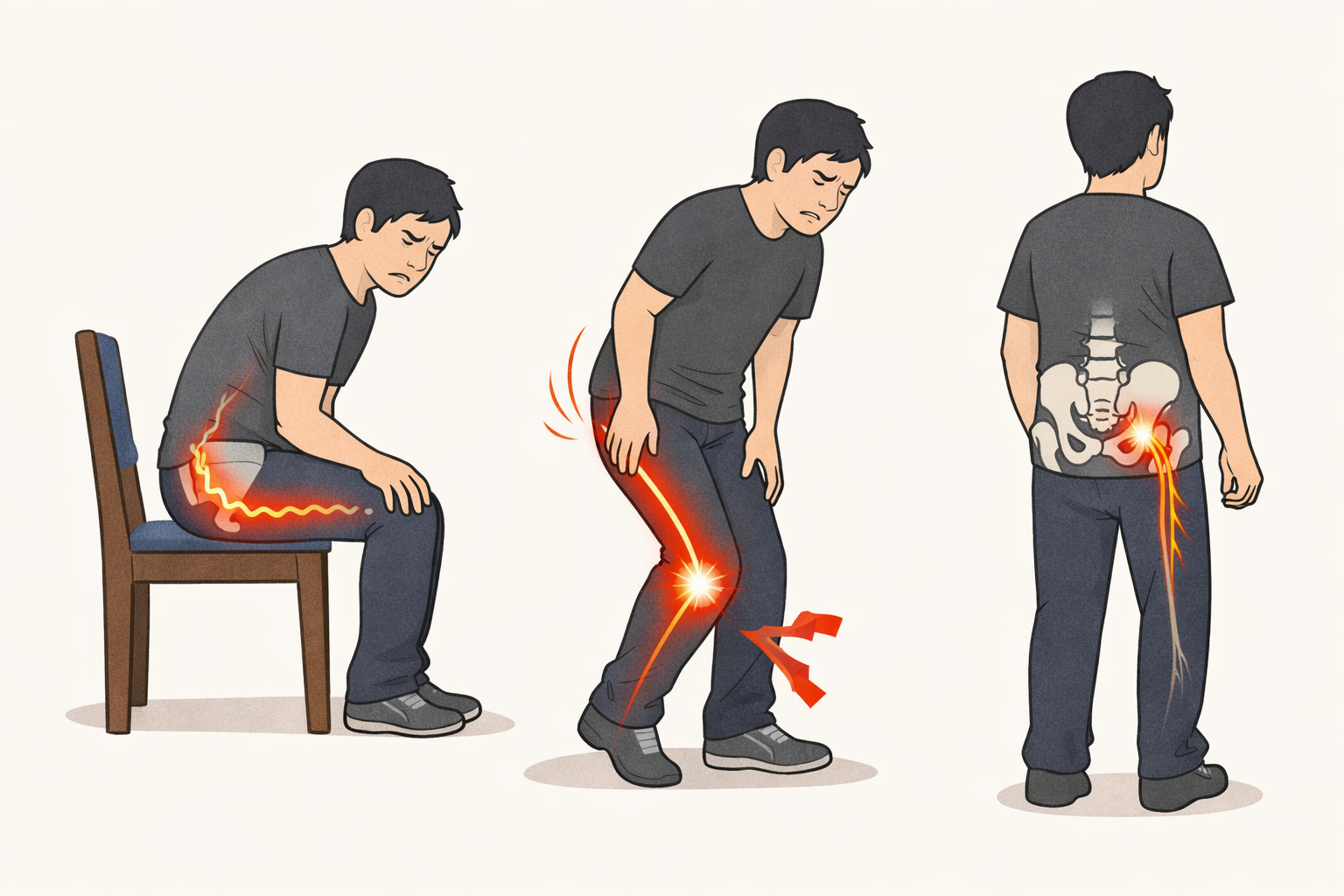 このような症状は、一般的に「坐骨神経痛」と呼ばれる状態です。
